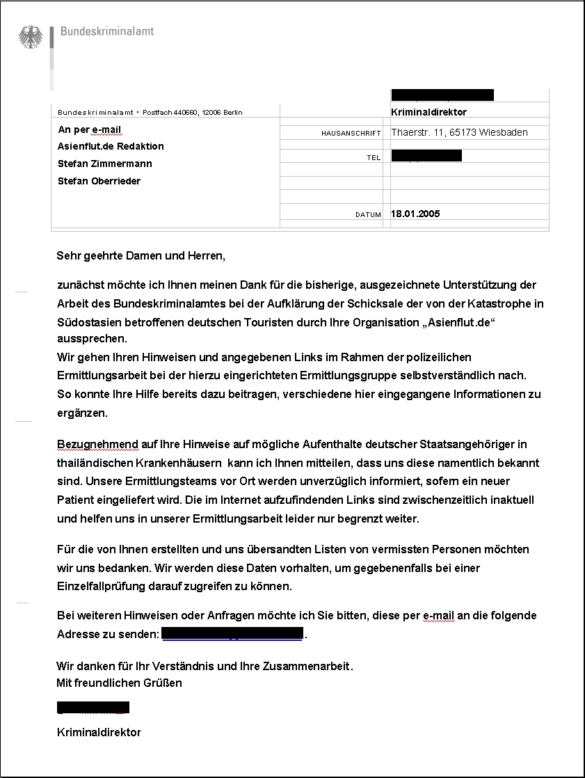AKTION "DEUTSCHLAND SPENDET": Mit Hilfe des Spendenkontos von Herrn Prof. Dr. Samuel Laubscher hat Asienflut.de eine kurzfristige Spendenaktion ins Leben gerufen. Ein herzlicher Dank gilt allen Spendern, die zusammen 1640 € gespendet haben. Das Geld wurde zur Unterstützung Betroffener hier in Deutschland gesammelt. Es gibt unzählige Schicksale und Betroffene, die nachhaltige finanzielle Unterstützung benötigen. Die Entscheidung über die Verwendung des Geldes ist uns daher nicht leicht gefallen. Gerne würden wir allen Betroffenen finanziell helfen. Wir haben uns demnach nach sehr langer Prüfung und internen Absprachen für einen ganz besonders schweren Fall entschieden. Wir werden ein kleines Mädchen finanziell unterstützen, welches am 26.12.2004 seine gesamte Familie verloren hat und jetzt aufgrund deutscher Bürokratie schwerwiegende finanzielle Probleme hat. Bitte haben Sie Verständnis, dass wir hier weitere Details hier zum Schutz des Mädchens nicht nennen. Alle Spender erhalten selbstverständlich genauere Auskunft über die Verwendung Ihrer Spende. Senden Sie uns hierzu als Spender bitte Ihren Namen und den Betrag, den Sie gespendet haben an redaktion-asienflut@web.de Nach Abgleich Ihrer Daten mit den Spendeneingängen, werden wir uns persönlich mit Ihnen in Verbindung setzten. DANKSAGUNG: An dieser Stelle möchten wir uns ganz herzlich bei allen Unterstützern bedanken, ohne die es uns nicht möglich gewesen wäre, in diesem Umfang zu helfen: